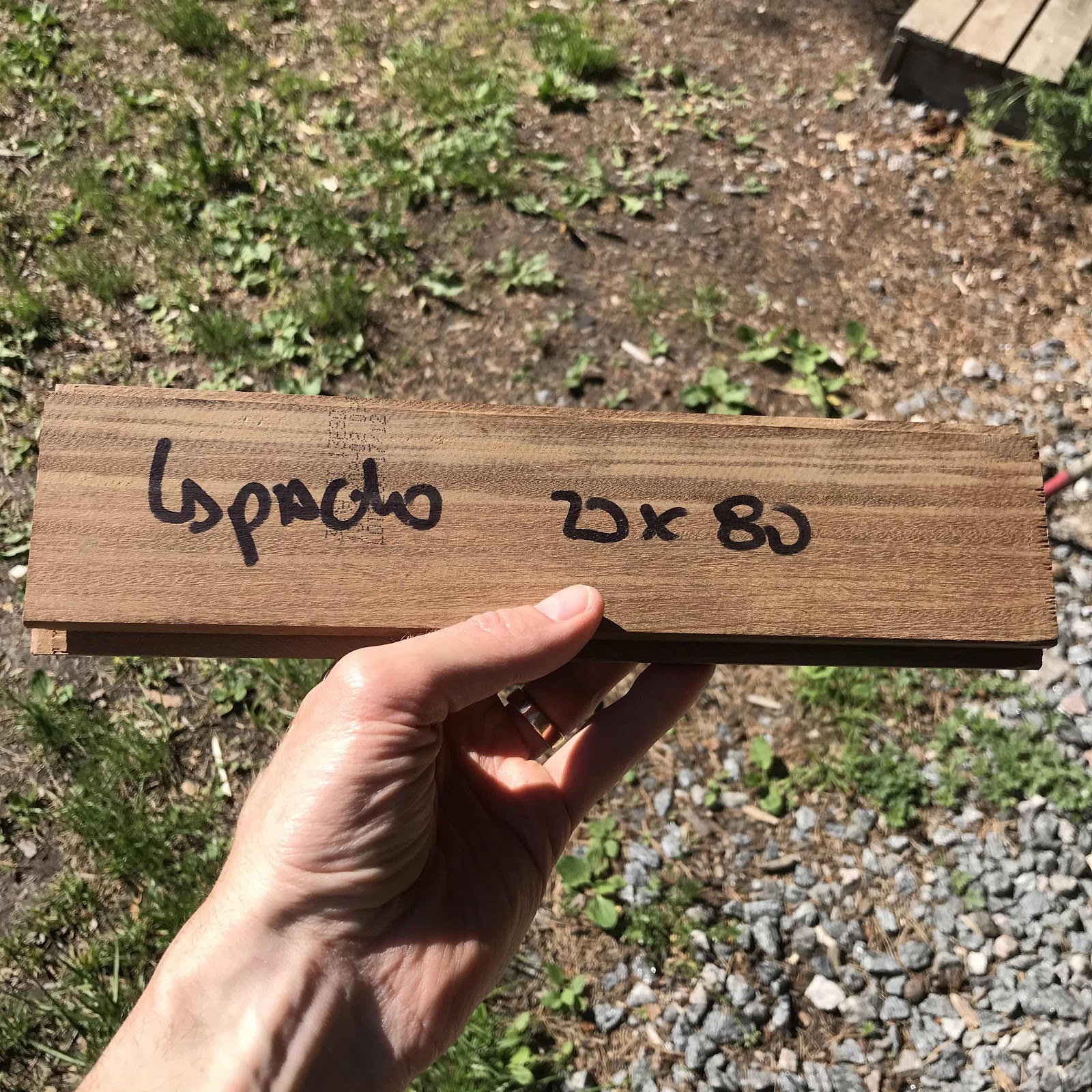 First piece was this, a floor board sample from a shop in Buenos Aires, pilfed on a work trip a few yeara back. It says ”lapacho” on it, which I gather is another name for ipe. It’s an insanely dense and hard species.