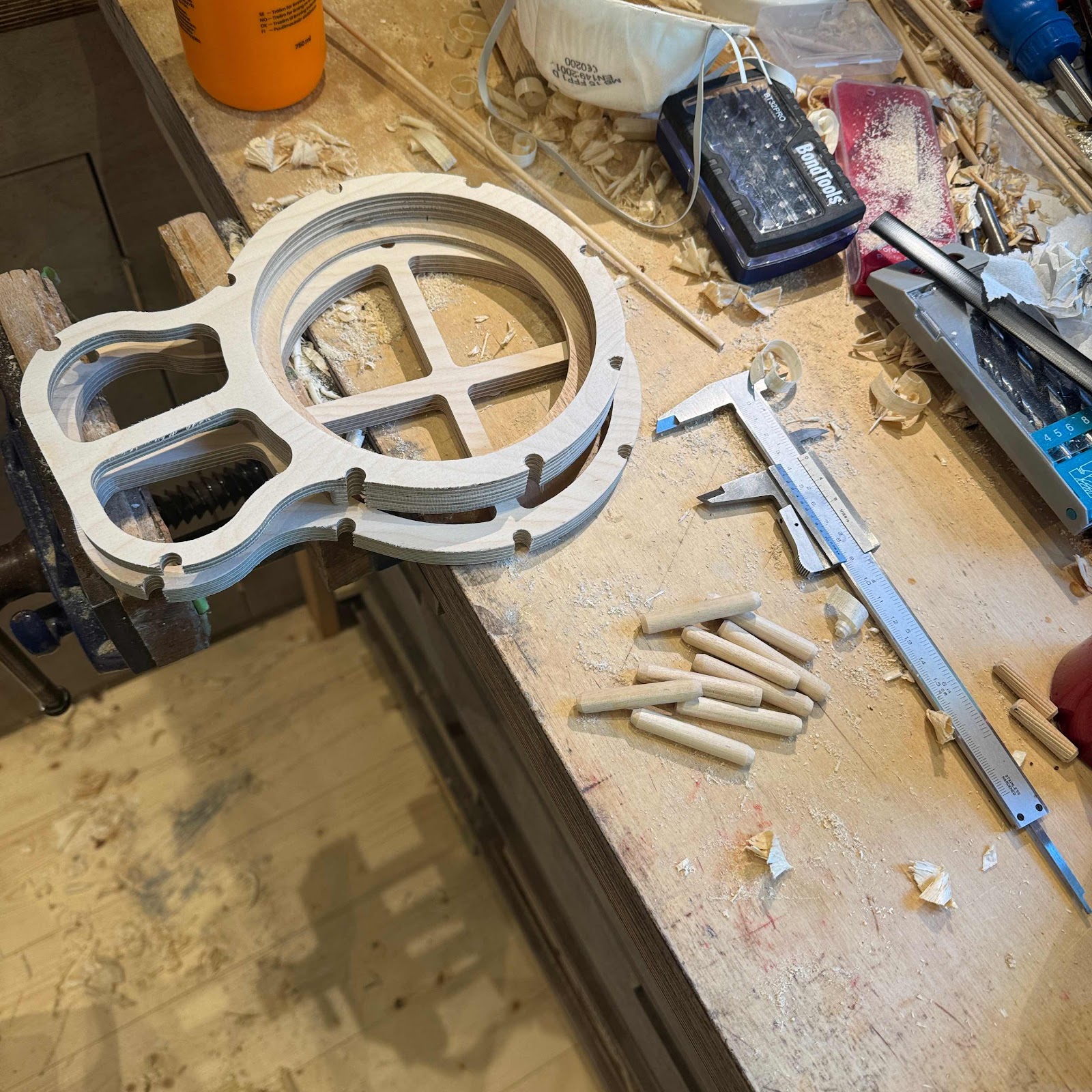 But now the new workshop is well under way to completion. I have spent a month constructing storage solutions for the tools, and today I dug into the remaining boxes of… stuff, and found the small pile of resonator skeletons.